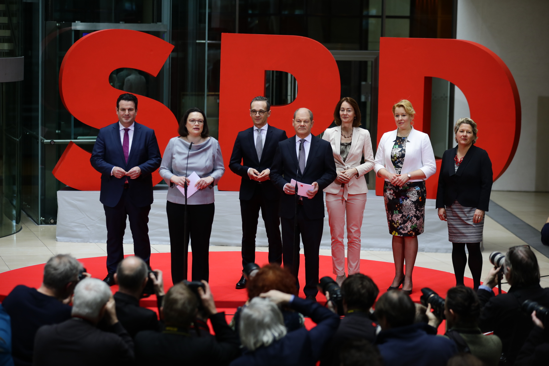 Heiko Maas wird neuer Bundesaußenminister, Katarina Barley neue Bundesjustizministerin, Hubertus Heil wird neuer Bundesarbeitsminister, Svenja Schulze übernimmt das Amt der Bundesumweltministerin, Olaf Scholz wird Bundesfinanzminister und Vizekanzler und Franziska Giffey wird Bundesfamilienministerin.